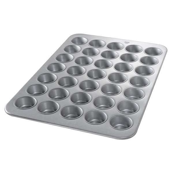 Cupcake/Muffin Pan, Gauge 26 ga, Material Aluminized Steel, Dishwasher Safe No, Freezer Safe No, Oven Safe Yes, Capacity 3.8 oz, Color Silver, Overall Length 25 7/8 in, Overall Width 17 7/8 in, Overall Depth 1 3/8 in, NSF Certified No, Number of Slots 35, Pan Style Cupcake Pan