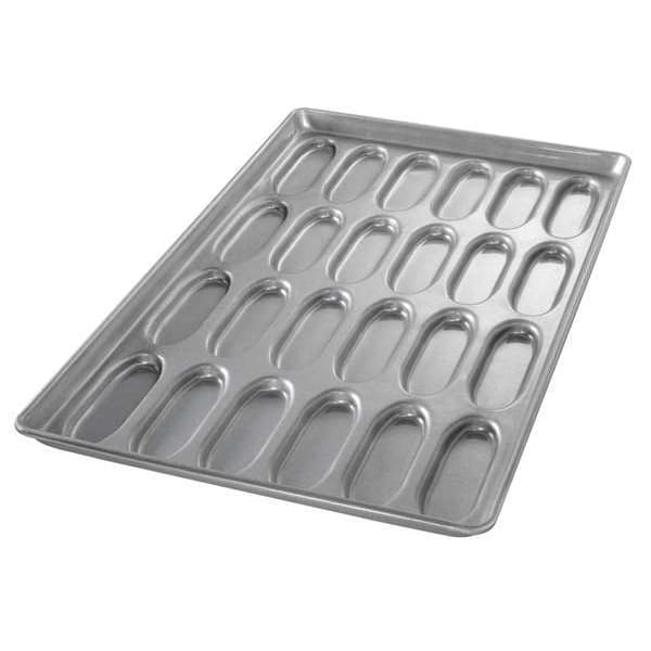 Hot Dog Bun Pan, Gauge 22 ga, Material Aluminized Steel, Dishwasher Safe No, Freezer Safe No, Oven Safe Yes, Color Silver, Overall Length 27 3/4 in, Overall Width 16 3/4 in, Overall Depth 1 5/8 in, NSF Certified No, Number of Slots 24, Pan Style Hot Dog Bun Pan