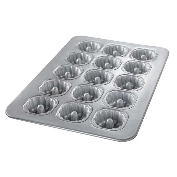 Cake Pan, Material Aluminized Steel, NSF Certified No, Oven Safe Yes, Product Type Mini Bundt Cake Pan, Dishwasher Safe No, Freezer Safe No, Perforation Solid, Capacity 7.5 oz, Color Silver, Overall Length 25 7/8 in, Overall Width 17 7/8 in, Overall Depth 1 11/16 in, Gauge 22 ga, Number of Slots 15, Bead Closure Closed Bead, Overall Diameter Not Applicable, Coating Glazed