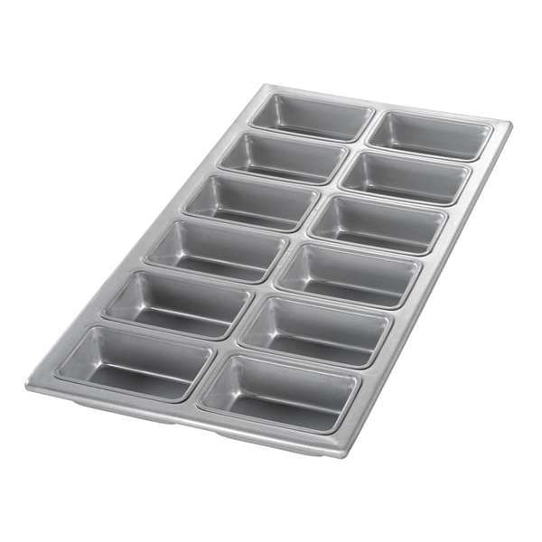 Mini Loaf Pan, Gauge 26 ga, Material Aluminized Steel, Dishwasher Safe No, Freezer Safe No, Oven Safe Yes, Capacity 6.4 oz, Color Silver, Overall Length 19 1/2 in, Overall Width 9 7/8 in, Overall Depth 1 3/8 in, NSF Certified No, Number of Slots 12, Pan Style Mini-Loaf Pan