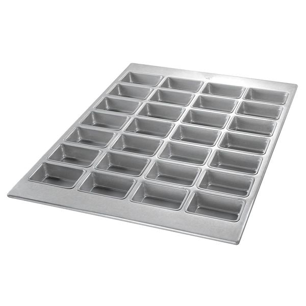 Mini Loaf Pan, Gauge 26 ga, Material Aluminized Steel, Dishwasher Safe No, Freezer Safe No, Oven Safe Yes, Capacity 6.4 oz, Color Silver, Overall Length 25 7/8 in, Overall Width 18 7/8 in, Overall Depth 1 3/8 in, NSF Certified No, Number of Slots 28, Pan Style Mini-Loaf Pan