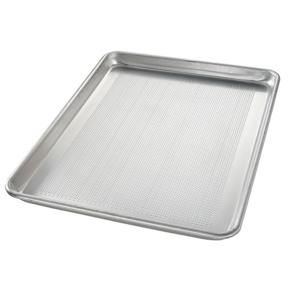 Sheet Pan, Sheet Pan Size One Half, Material Aluminum, NSF Certified No, Oven Safe Yes, Product Type Sheet Pan, Dishwasher Safe No, Freezer Safe No, Perforation Perforated, Color Silver, Overall Length 17 13/16 in, Overall Width 12 7/8 in, Overall Depth 1 in, Gauge 18 ga, Bead Closure Closed Bead, Overall Diameter Not Applicable, Coating Uncoated