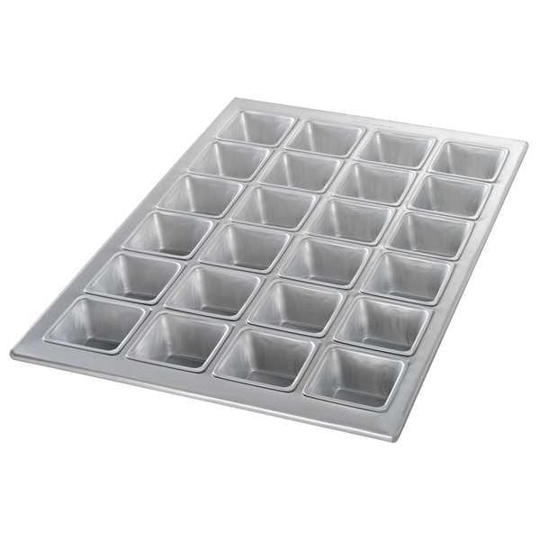 Square Muffin Pan, Gauge 20 ga, Material Aluminum, Dishwasher Safe No, Freezer Safe No, Oven Safe Yes, Capacity 4.4 oz, Color Silver, Overall Length 20 3/4 in, Overall Width 14 1/8 in, Overall Depth 1 5/8 in, NSF Certified No, Number of Slots 24, Pan Style Muffin Pan