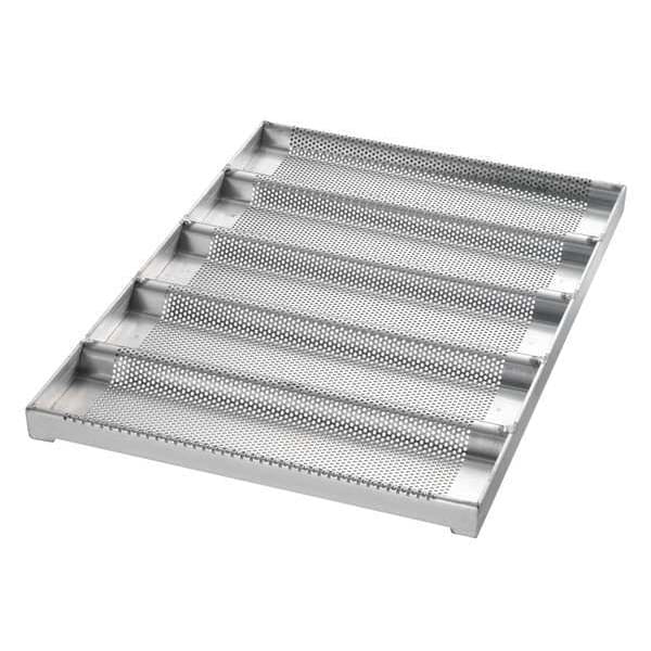 Sub Sandwich Roll Pan, Gauge 16 ga, Material Aluminized Steel, Dishwasher Safe No, Freezer Safe No, Oven Safe Yes, Color Silver, Overall Length 17 3/4 in, Overall Width 17 3/4 in, Overall Depth 3/4 in, NSF Certified No, Number of Slots 5, Pan Style Half-Size Sub Sandwich Roll Pan