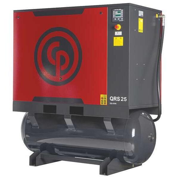 Rotary Screw Air Compressor w/Air Dryer, Air Tank Style Horizontal, Output Power 25 hp, Free Air Flow Rate @ Maximum Pressure 84.5 cfm, Maximum Operating Pressure 132 psi, Air Tank Size 132 gal, Phase Three, Input Voltage 208 to 230V AC, 460V AC, Air Dryer Included Yes, Pump Type Rotary Screw, Current Rating 70/62/31 A, Maximum Speed 4,355 RPM, Duty Cycle Continuous, Sound Level 72 dBA, Enclosure Type Totally Enclosed