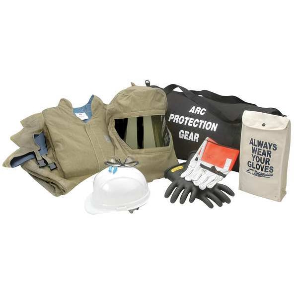 Arc Flash Clothing Kit, Olive, Size 2XL, Fits Chest Size 52 in to 54 in, Fits Waist Size 44 in to 46 in, Inseam 32 1/8 in, Material FR Cotton Blend (88 Percent Cotton, 12 Percent Nylon), Hazard Risk Category (HRC) 4, Standards ASTM F1606-00, NFPA 2112, NFPA 70E 2012, Includes 14 in Class 2 Rubber Gloves And 12 in Protector Gloves, Ear Plugs, Glove Bag and Gear Bag, Hood With Hard Cap, Jacket and Bib, Safety Glasses