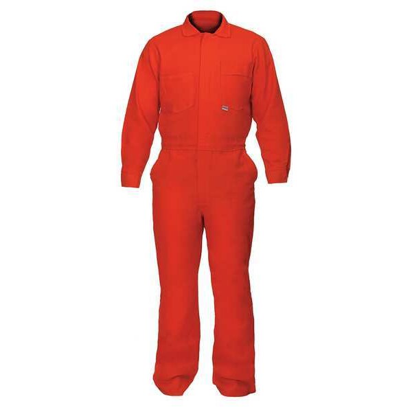 ATPV Rating 10.8 cal/sq cm, Arc Flash PPE Category 2, Closure Type Zipper, Collar Style Stand-Up, Color Orange, Fabric Weight 9 oz, Features and Welding Exposures, Double-Shrunk Technology, Flash Fire, Molten Ferrous Metal, Multipurpose Protection from Electric Arc Flash, Gender Men's, Inseam 32 in, Insulated for Cold Conditions No, Coverall, Material Trade Name Indura, Maximum Chest Size 50 in, Maximum Waist Size 44 in, Minimum Chest Size 48 in, Minimum Waist Size 42 in