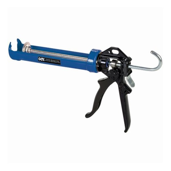 Features a wear-compensating device which doubles gun's life. Mechanical advantage 12:1. All component replaceable parts. Die-cast zinc alloy body. Barrel turns for application around corners.
