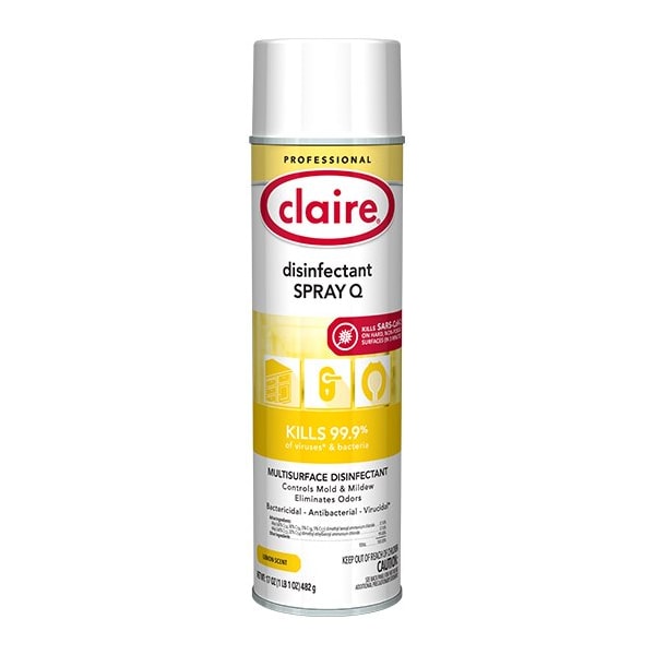 Claire Disinfectant Spray Q EPA Reg. No. 706-111 has demonstrated effectiveness against viruses similar to 2019 Novel Coronavirus 2019-nCoV on hard non-porous surfaces. Therefore, Claire Disinfectant Spray Q can be used against 2019 Novel Coronavirus 2019-nCoV when used in accordance with the directions for use against Poliovirus type 1 on hard, non-porous surfaces. Refer to the CDC website https://www.cdc.gov/coronavirus/2019-ncov/index.html for additional information. Lemon Scent. Hospital grade multipurpose disinfectant for hard, non-porous surfaces. Soft spot surface sanitizer. Controls mold and mildew. Eliminates odors. Kills 99.9% germs. Bactericidal, Antibacterial, Fungicidal, *Virucidal, Tuberculocidal. NSF Certified. Size 20 oz. can. Net Weight 17 oz. Units/Pack 12 cans.