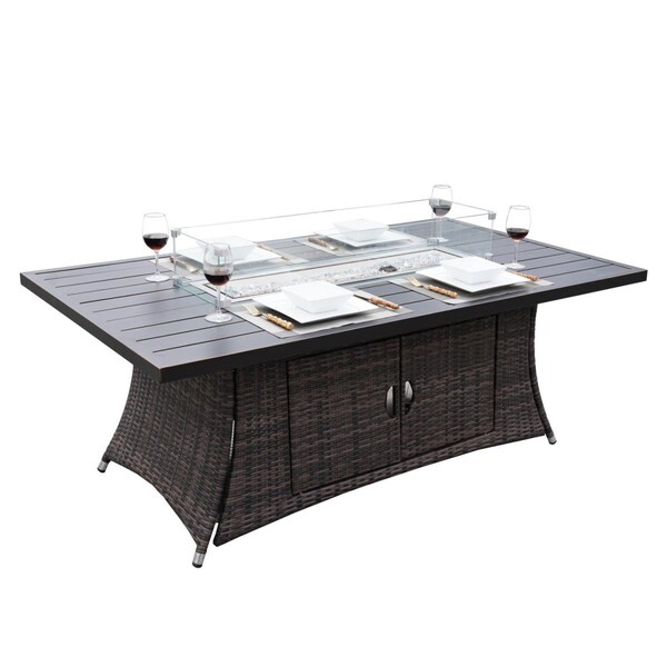 Outdoor Patio Rattan Gas Fire Pit Rectangle Dining Table, Brown