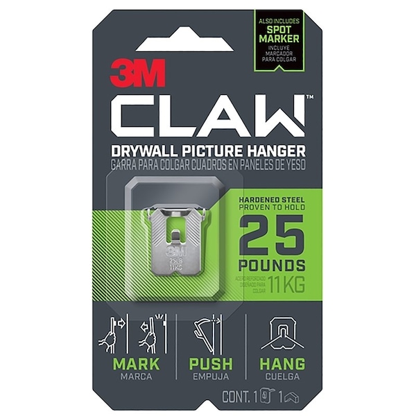 Introducing the new 3M CLAW drywall picture hanger! Trust your heavyweight hanging projects to the 3M CLAW drywall picture hanger proven to hold up to 15, 25 and 45 lb. The engineered hardened steel claws lock securely into drywall anywhere just push, hang and you're done.