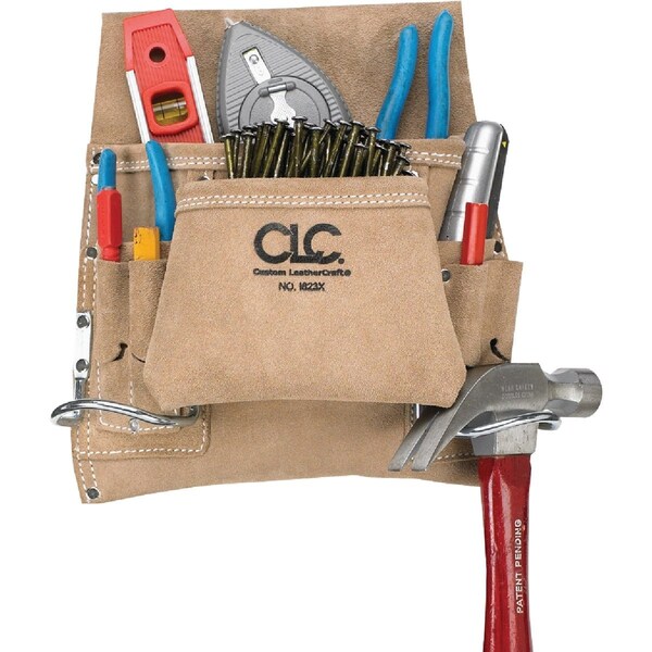2 main nail pockets 6 small pockets steel hammer loop. Tunnel belt loop for up to 2-3/4 wide belts. Double nylon stitched and rivet reinforced. Can be worn on right or left side. Heavy-duty suede leather. Import.