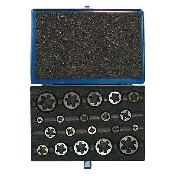 Die Set, Hex, Solid, Carbon Steel, Number of Dies in Set 20, Thread Sizes Included 1 In.-14, 1 In.-8, 1/2 In.-13, 1/2 In.-20, 1/4 In.-20, 1/4 In.-28, 3/4 In.-10, 3/4 In.-16, 3/8 In.-16, 3/8 In.-24, 5/16 In.-18, 5/16 In.-24, 5/8 In.-11, 5/8 In.-18, 7/16 In.-14, 7/16 In.-20, 7/8 In.-14, 7/8 In.-9, 9/16 In.-12, 9/16 In.-18, Thread Standard UNC, UNF, UNS, Thread Direction Right Hand, Die Sizes included 1 in, 1/2 in, 1/4 in, 3/4 in, 3/8 in, 5/16 in, 5/8 in, 7/16 in, 7/8 in, 9/16 in, Case Type Plastic