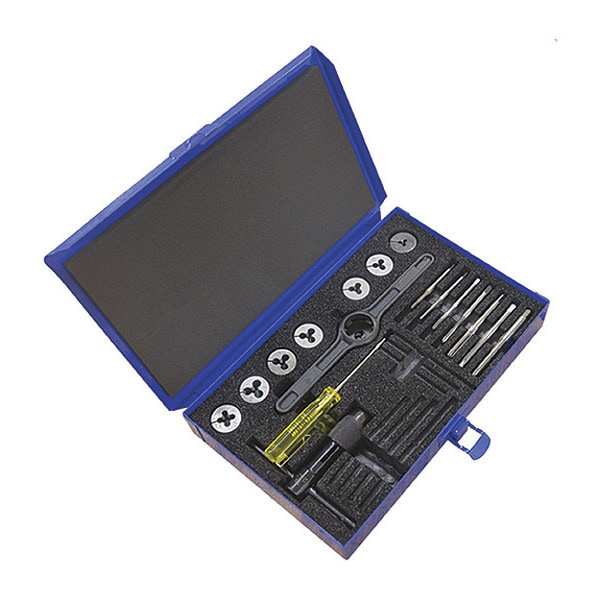 Tap and Die Set, Number of Pieces 17, Die Shape Round, Tap Type Hand Tap, Die Material High Speed Steel, Thread Sizes Included M2.5x0.45, M3.5x0.6, M3x0.5, M4.5x0.75, M4x0.7, M5x0.8, M6x1, Die Thread Sizes Included M2.5 x 0.45, M3 x 0.5, M3.5 x 0.6, M4 x 0.7, M4.5 x 0.75, M5 x 0.8, M6 x 1.0, Number Of Taps 7, Number of Dies in Set 7, Thread Standard Metric, Tap Shank Standard Table 302