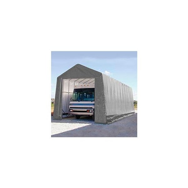 most economical protection for your rv, boat or motor home. Frame is manufactured from our 14 gauge, 1.90od allied gatorshield structural steel tubing. 7.5oz, 16mil silver/white cover has a long life expectancy. One solid end and one end with a 10'w x 12'6h door. Rafter spacing 4'. To provide secure and stable holding power, anchor accessories recommended. Choose from model b381149 b354301 or b354299.