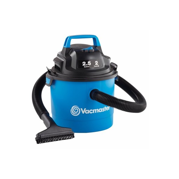 2.5-Gallon 2 Peak HP Wet/Dry Vacuum. This lightweight portable Vacmaster wet/dry vacuum is a great tool for quick clean-ups. It easily vacuums dry debris and liquids around the house workshop or car. When the job is done the accessories are easily stored and the vacuum can be mounted on the wall to save space. Included accessories: 4 x 1-1/4 Hose 2-in-1 Utility Nozzle Crevice Tool Reusable Cloth Filter Foam Wet Filter Wall Mount Bracket