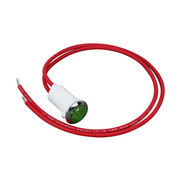 Green Signal Light;250 V [ Fits Hole 1/2" ] [10" Leads ] [Color Green] ;[ Type Hat Flat ][ Bezel Chrome] [ Fastener Lock Tabs] ;,Flat On Side;Cleveland Skillet