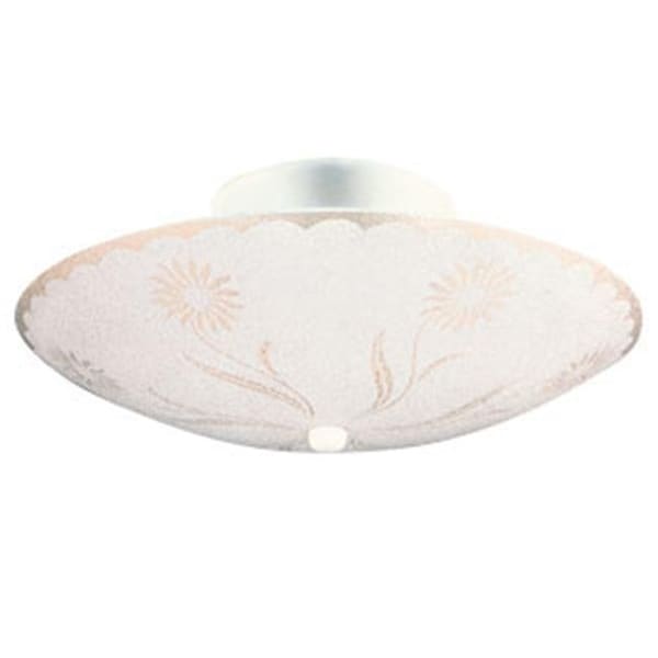 The 2-Light Textured Floral Ceiling Mount has an elegant design that complements any closet, bedroom or hallway. The formed steel is finished in white with textured floral glass give to provide a soft look and warm, comforting glow. As one of the most popular styles of light fixtures, ceiling mounts are suited for any room in the house as they hang close to the ceiling with a subtle half-moon shape. This 2-light ceiling mount is rated for 120-volts and uses (2) 60-watt medium base incandescent bulbs.
