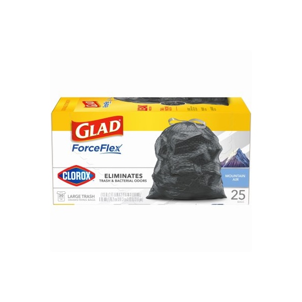25 count, 30 gallon, Mountain Air trash bags Glad ForceFlex with Clorox Drawstring Large Trash Bags feature Glad's strongest large trash bag with Clorox protection to eliminate trash and bacterial odors Built with LeakGuard protection, RipGuard protection, and the trusted stretchable strength of Glad's ForceFlex technology to let you carry the heaviest loads without tearing the bag Advanced tear and puncture protection