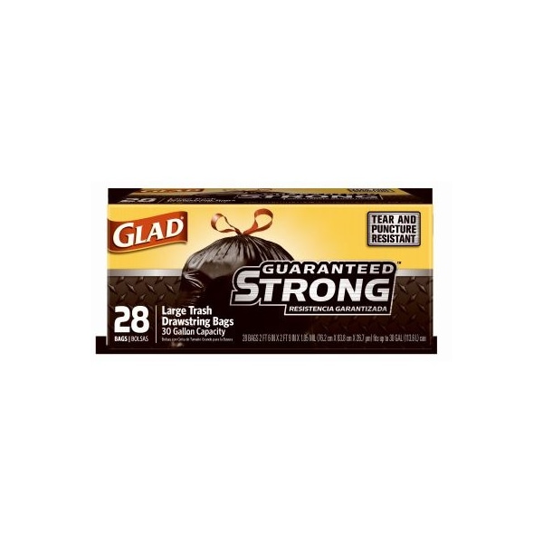 Glad, 28 Count, 30 Gallon, 110 Mil, Black, Drawstring Closure, Outdoor Trash Bag, Even Thicker Extra Strong 3 Ply Strength Bags, Rolled