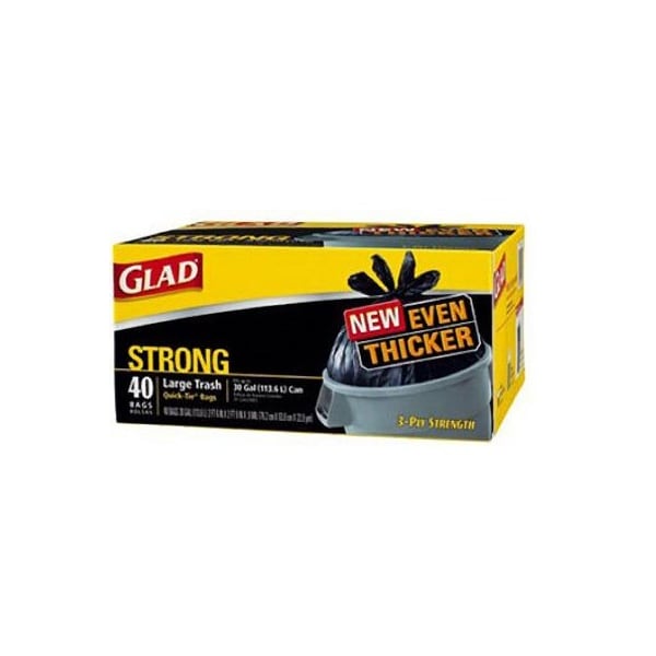 Glad, 40 Count, 30 Gallon, 110 Mil, Black, Quick Tie Closure, Outdoor Large Trash Bag, 2' 6 x 2' 8, 3 Ply Strength, Boxed