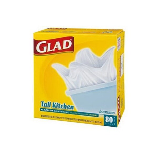 Glad, 80 Count, 13 Gallon, 69 Mil, White, Quick Tie Closure Tall Kitchen Bag, 2' x 2' 4, 3 Ply Strength, Boxed