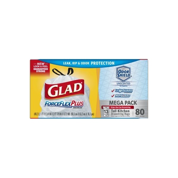 Glad, 80 Count, 13 Gallon, White, Force Flex, Drawstring Closure, Tall Kitchen Bag, Patented Force Flex Technology, Stretchable Strength, Boxed