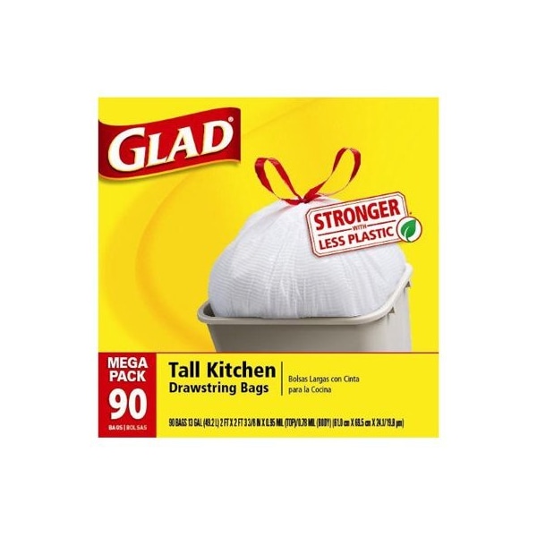 Glad, 90 Count, 13 Gallon, 9 Mil, White, Drawstring Closure, Tall Kitchen Trash Bag, 2' x 2' x 338, Boxed