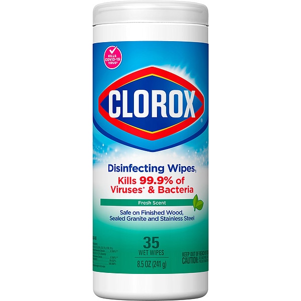 Disinfectant, Disinfecting Wipes, Primary Chemical Quat, Targeted Pathogens E-coli, H1N1, Salmonella, Wet Contact Time 3 to 4 min, Canister, Container Size 35 ct, Ready to Use/Concentrated Ready to Use, Cleaner Form Wipes, Sheet Size 8 in x 7 in, Application Disinfecting/Sanitizing, Fragrance Fresh, White, Disposable/ Reusable Disposable, EPA Registered Yes, EPA Registration Number 5813-79, NSF Rating Not Rated, Product Series No Series, Sheet Length 8 in, Sheet Width 7 in, EPA Registered