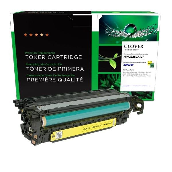 Clover Imagings color laser cartridges are developed using state-of-the-art, high-quality color toner that performs as well as, or better than, Original Equipment Manufacturer OEM cartridges. Clover Imagings environmentally sustainable color laser cartridges are remanufactured using 89.6% recycled content and are designed to keep cartridges out of landfills and money in your pocket.Clover Imaging has the solution for you.Clover remanufactured printer cartridges are designed to meet or exceed HP brand print quality, page yield, and reliability.Compatible Hardware: HP Color LaserJet CM3530 MFP, CM3530FS MFP, CP3525DN, CP3525N, CP3525XPage Yield: 11000 | Color: YellowCompatible with: HP Color LaserJet CM3530 MFP, HP Color LaserJet CM3530FS MFP, HP Color LaserJet CP3525DN, HP Color LaserJet CP3525N, HP Color LaserJet CP3525X. Compares to: HP 2641B004AAJ, HP CE252AJ.