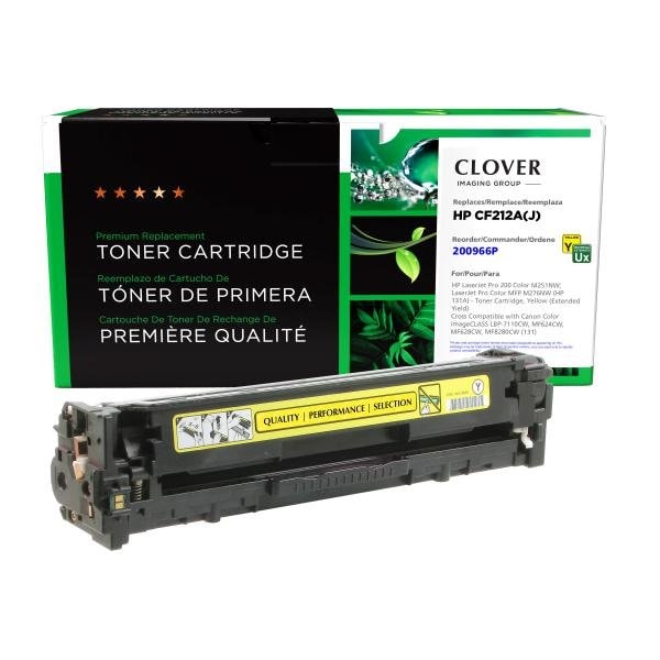 Clover Imagings color laser cartridges are developed using state-of-the-art, high-quality color toner that performs as well as, or better than, Original Equipment Manufacturer OEM cartridges. Clover Imagings environmentally sustainable color laser cartridges are remanufactured using 89.6% recycled content and are designed to keep cartridges out of landfills and money in your pocket.Clover Imaging has the solution for you.Clover remanufactured printer cartridges are designed to meet or exceed HP brand print quality, page yield, and reliability.Compatible Hardware: HP LaserJet Pro 200 Color M251NW; LaserJet Pro Color MFP M276NW; Canon Color imageCLASS LBP-7110CW, MF624CW, MF628CW, MF8280CW 131Page Yield: 2400 | Color: YellowCompatible with: Canon Color imageCLASS LBP-7110CW, Canon Color imageCLASS MF624CW, Canon Color imageCLASS MF628CW, Canon Color imageCLASS MF8280CW, HP LaserJet Pro 200 Color M251NW, HP LaserJet Pro Color MFP M276NW. Compares to: Canon 131, Canon 6269B001AAJ.