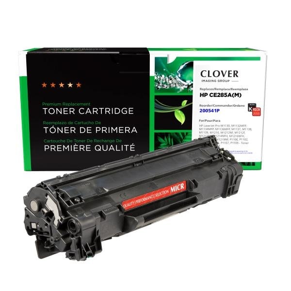Clover Imaging remanufactured MICR cartridges provide businesses with the quality they require, the value they need, and the superior environmental solution they want. Clover Imaging MICR cartridges meet all U.S. and Canadian banking standards for signal strength and are manufactured using a special high adhesion toner formula, designed specifically for your printer, that significantly reduces the possibility of costly fees stemming from rejected checks.Clover remanufactured MICR cartridges are designed to meet all U.S. and Canadian banking standards.Compatible Hardware: HP LaserJet Pro M1130, M1132MFP, M1134MFP, M1136MFP, M1137, M1138, M1139, M1210, M1212NF, M1212F, M1213NF, M1214NFH, M1216NFH, M1217NFW, M1219NF, P1100, P1102, P1102W, P1104, P1107, P1109Page Yield: 1600 | Color: BlackCompatible with: HP LaserJet Pro M1130, HP LaserJet Pro M1132 MFP, HP LaserJet Pro M1134 MFP, HP LaserJet Pro M1136 MFP, HP LaserJet Pro M1137, HP LaserJet Pro M1138, HP LaserJet Pro M1139, HP LaserJet Pro M1210, HP LaserJet Pro M1212F, HP LaserJet Pro M1212NF, HP LaserJet Pro M1213NF, HP LaserJet Pro M1214NFH, HP LaserJet Pro M1216NFH, HP LaserJet Pro M1217NFW, HP LaserJet Pro M1219NF, HP LaserJet Pro P109, HP LaserJet Pro P1102, HP LaserJet Pro P1102W. Compares to: HP 85A, HP CE285A, HP CE285AM.