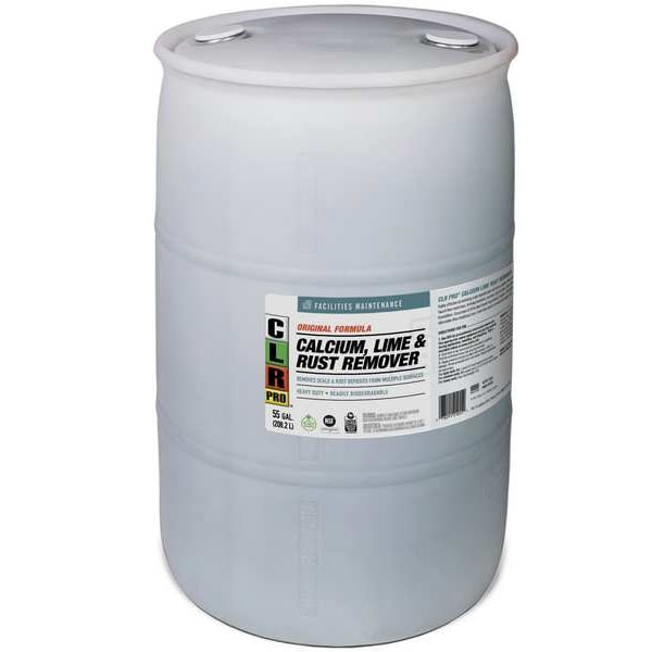 Calcium, Lime and Rust Remover, Surfaces for Use On Brass, Chrome, Copper, Fiberglass, Glass, Porcelain, PVC/Plasic, Stainless Steel, Vinyl, Drum, 55 gal, Concentrated, Recommended Dilution 1:8 (Light Soil); 1:1 (Medium Soil), Cleaner Form Liquid, Product Series CLR(r) Pro, Rinse Required Yes, VOC Content 0 Percent, NSF Rating A3, Nonflammable Yes, Net Weight 5 gal