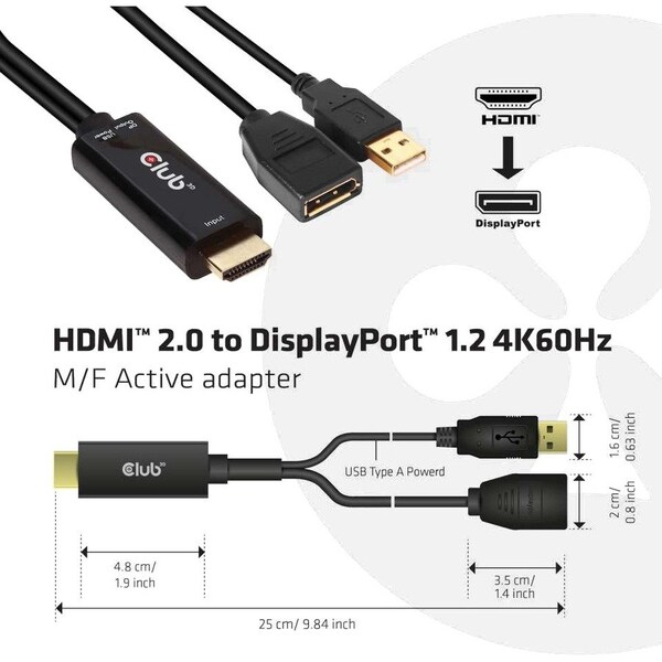 (1) Powered USB Type A - Male, (1) HDMI 2.0 Digital Audio/Video - Male