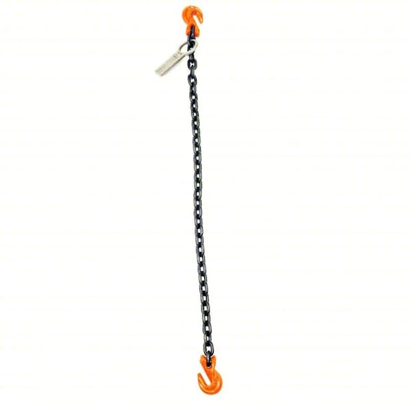 Chain Sling, Chain Adjustability Fixed, Chain Grade 100, Chain Trade Size 3/8 in, Sling Length 10 ft, Number of Legs 1, Hook Opening Width 15/32 in, Load Capacity @ 90 Degrees 8,800 lb, Hook Type Included Grab Hook, Master Link Inside Length Not Applicable, Master Link Inside Width Not Applicable, Chain Color Black, Orange, Fitting Material Alloy Steel