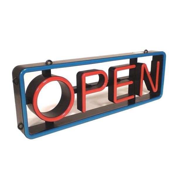 LED Open Sign, Voltage 100 to 240, Watts 24 W, Length 27 3/4 in, Width 2 3/4 in, Height 9 1/4 in, Legend/Background Color Red/Blue, Material Plastic, Temp. Range -40 Degrees F to 90 Degrees F, Rated Life 50,000 hr, Standards UL Listed, Includes Power Supply, Hanging Chains and Remote with Battery, Warranty 2 yr