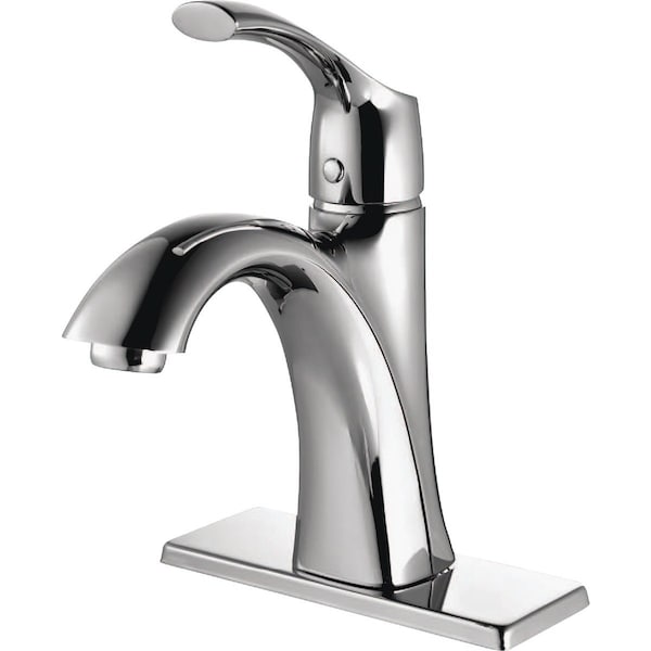 The Brookfield single-handle polished chrome bathroom faucet includes a removable zinc deck plate that allows for single or three hole installation. The faucet features a 4-1/16 In. high x 5-3/8 In. long spout two piece zinc body and zinc handle. It also includes a pop-up drain assembly and solid brass waterway construction with 1/2 In.-14 NPSM connection.