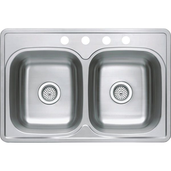 Top mount 50/50 double bowl kitchen sink constructed with premium grade 304 stainless steel. Offering your sink a kind of durability and strength others cant. This sink has a 7-inch depth 22-gauge and a standard 3-1/2-inch drain opening. The lustrous satin finish and fully coated underneath with heavy-duty sound-deadening pads give your sink a shine and maximum noise absorption. Complete with u-channel clips installation instructions and cutout template with a DXF file available this sink is everything youve been looking for and more.