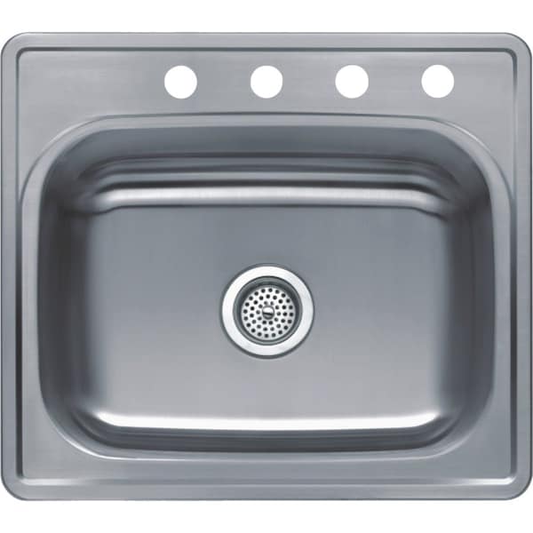Top mount single bowl in a stainless steel finish a tried and true classic for your kitchen. This sink is made of 22-gauge 304 stainless steel is 8 inches deep and has a standard 3-1/2-inch drain opening. Comes in lustrous satin finish and is fully coated underneath with a heavy-duty sound-deadening pad for maximum shine and noise absorption. Supplied with u-channel clips installation instructions and cutout template with a DXF file available to ease the installation process.
