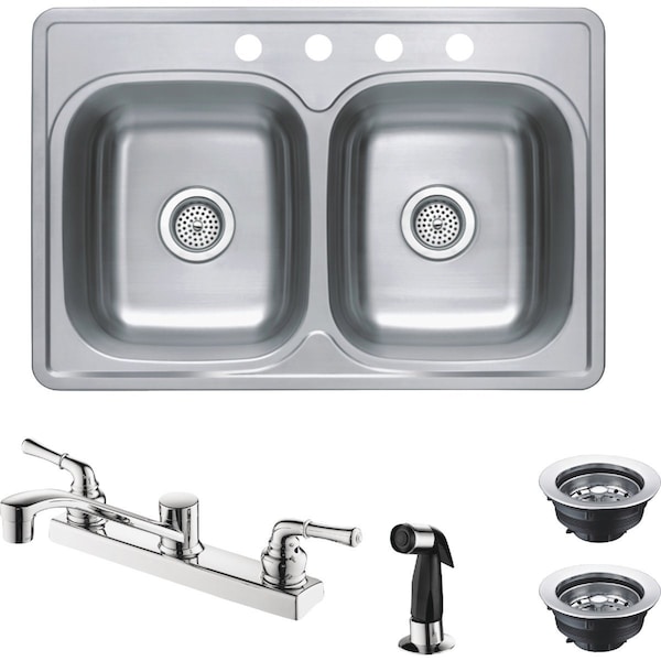The Grab-N-Go Sink Kit includes a top-mount 50/50 double bowl two-handle kitchen faucet with side spray and matching strainers in polished chrome finish to spruce up any kitchen or laundry room. This Grab-N-Go sink features a lustrous satin finish stainless steel sink with a 3-1/2 In. drain opening. The sink comes fully coated underneath with heavy-duty sound deadening pads installation instructions U-channel clips and a cutout template (DXF file available) for easy installation. The faucet offers washerless cartridges brass waterway construction and installation with 1/2 IPS connections.
