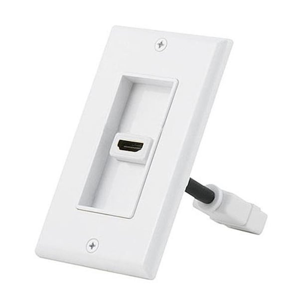 White HDMI wall plate with 4 inch coupler cable. This convenient wall plate has a female connector on the front and in back for easy installation. Eliminate cable clutter by hiding your cables in-wall. This clean looking wall plate will give your home theater a professionally installed look. Wall-mounted HDMI connections for home theater systems HDMI 1.3 compatible HDMI connections Single-gang wall plate Fits into a standard single-gang J-Box or P-Ring Attractive Decora-style wall plate HDMI Single Port Color White