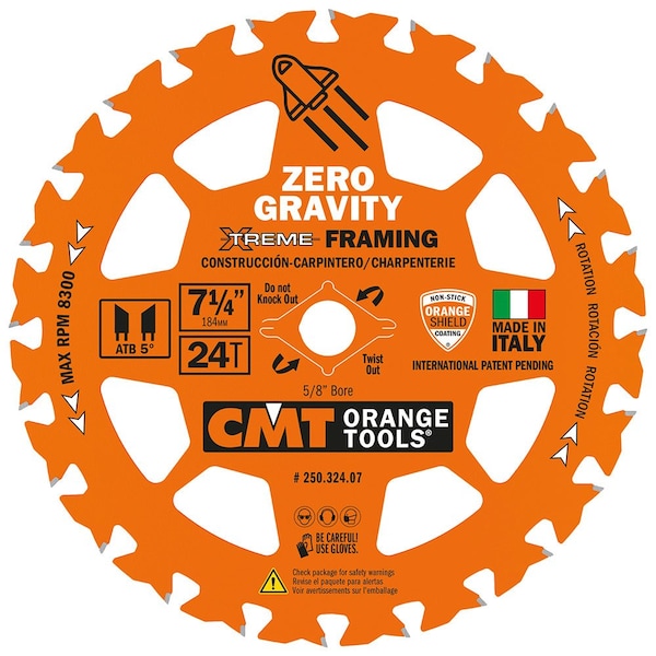 CMT Orange Tools 250.324.07-1 FRAMING Zero Gravity 7-1/4x5/8 1-PackCMT Orange Tools Xtreme Zero Gravity blades have a patented design that reduces blade mass, minimizes heat, and substantially increases cutting efficiency with cordless and corded saws. The new gullet design is more efficient at clearing wood chips quickly. The saw blade becomes lighter to feed, is faster in the cut, and handles thicker materials better.