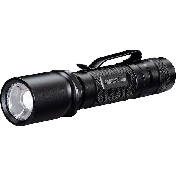 Beatthedark with versatility. TherechargeableTX17R, ideal fordynamicbeam control in themedium-to-long range,flexesthefull capabilities of theCOAST PURE BEAMsystem-deliveringseamless transitions between Ultra View Flood Beamand BULLS-EYESpot Beam. Maxing out at 1250 lumens with a 234-meter 767-foot beam, this three-mode flashlight medium, high, low isjustunder6incheslong and fitted with a reversible pocket clip to make it the ultimate carry-everywhere, do-anything lighting solution. Control the beam shapewith subtle pushes and pullsusing the SLIDE FOCUSsystem, or simply twist the bezel to set the beam where you like it with theBEAM LOCK.To support hands-free operation,the anti-roll bezel prevents theflashlightfrommoving when placed on uneven surfaces.From full power, the TX17R can run up to21hours on low andthenrecharges via USB-C. The COAST Rechargeable Plus system allows the flashlight to run on its ZITHION-XZX850lithiumbattery oron two CR123 disposable lithium batteriespurchasedseparatelyfor added convenience. Machined from solid aluminum, the TX17R is built to IP54 specifications for water resistance and dustresistance.