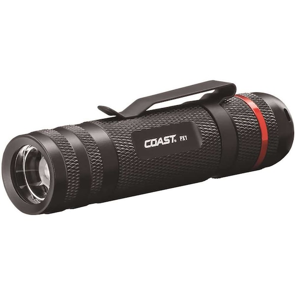 Coupling the Pure Beam Optic with the ability to twist focus, the PX1 Flashlight will be your trusted sidekick for all of your daily work in a variety of distances. While in flood mode, the light casts a huge circle of light that is equally bright across without any dark spots. Then twist it into spot mode, and the light will reach far downrange with a transition halo that allows for a large viewing area surrounding the tight spot beam. Add a reversible clip to either secure in your pocket or attach to the bill of your hat, and you have ultimate versatility. With Coasts commitment to quality, the PX1 Flashlight is impact resistant, weather resistant and its LED is virtually unbreakable. Tested and rated to ANSI/FL1 standards.Pack 2-powerful beams into one and seamlessly transition with no halos or hot spots between short and long-range viewing patented focusing technology adapts to your needDial in the shape of light you need for the situation twist focus system makes it easy to move between spot and flood beams by simply rotating the head of the flashlightHigh, low light modes: control your light power with the push of a button. Cycle between High power and low power optionsSpecs: light output 315 Lumens high, 25 Lumens low, beam distance: x meters high, x meters low, runtime: x hours high, x hours low,tested and rated to ANSI/FL1 standardsTough and reliable: IPX4 rated design for water resistance and durable body for 1-meter drop protection. INCLUDED ACCESSORIES: 3 x alkaline batteries and battery cartridgeImpact resistant
