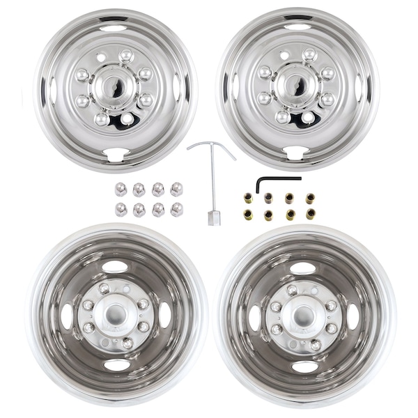Fits 16 Inch Dual Rear Steel Wheels; Front And Rear; Polished; Stainless Steel; Bolt On; 8 Lug/ 4 Hand Hole Wheels; Set Of 4