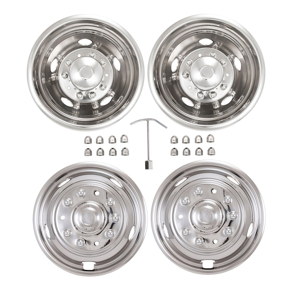 Fits 19-1/2 Inch Dual Rear Steel Wheels; Front And Rear; Polished; Stainless Steel; Bolt On; 10 Lug/ 5 Hand Hole Wheels; Set Of 4; Also Fits 2006-2009 Ford LCF/ 2006-2009 International CF500/CF600