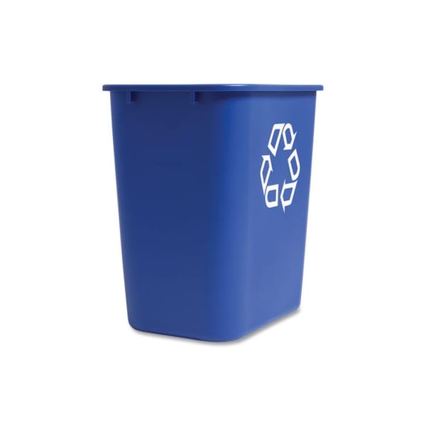 Encourage recycling while keeping the workplace tidy. Sturdy design can stand up to heavy loads. Soft molded plastic provides stability for occasional mishaps. Rolled rim adds strength when lifting. Easily identifiable universal recycling logo. Ideal for placing under desks and around the office. Waste Receptacle Type: Indoor Recycling Bin; Materials: Plastic; Application: Indoor Recycling; Colors: Blue.