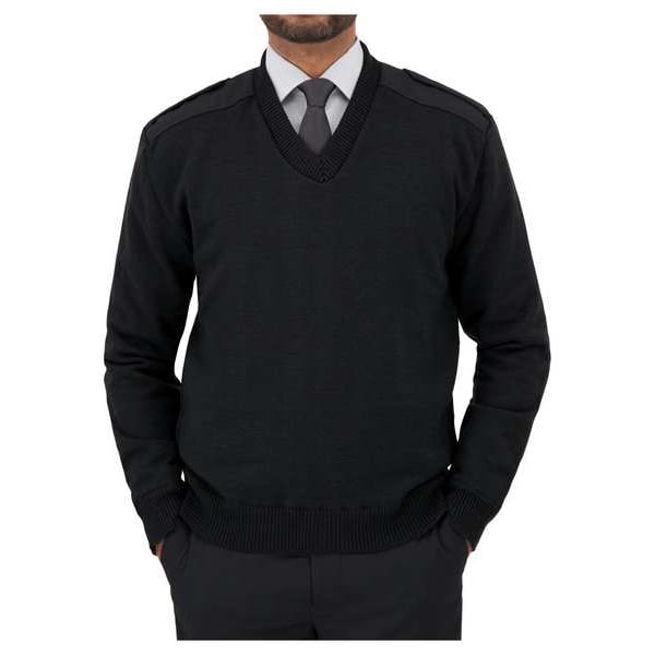 V-Neck Military Sweater, Size M, Color Black, Material 70 Percent Acrylic/30 Percent Wool, Fits Chest Size 43 In., Length 27 In., Sleeve Length 24-1/2 In., Garment Style Commando Sweater, Binding Pullover, Pockets No, Type Regular