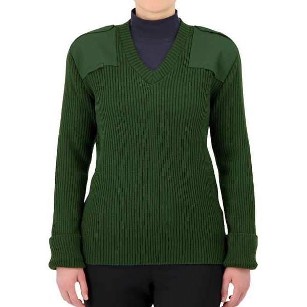 V-Neck Military Sweater, Size M, Color OD Green, Material 100 Percent Acrylic, Fits Chest Size 43 In., Length 27 In., Sleeve Length 27 In., Garment Style Commando Sweater, Binding Pullover, Pockets No, Type Regular
