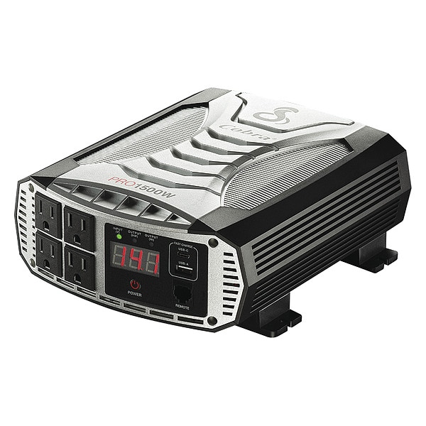 Inverter, Features Cobra Remote Compatible, LED Digital Display, Pentagon Protection Safety, Terminal Protector Boots, Output Form Modified Sine Wave, DC Connection Input Terminals, Continuous Output Power 1,500 W, Peak Output Power 3,000 W, Number of Outlets 6, Input Voltage 13V DC, Output Voltage 115V AC, Output Frequency 60 Hz, Efficiency 90 Percent, Overall Depth 9 3/4 in, Overall Height 3 1/2 in, Overall Width 8 3/8 in, Outlet Type (4) GFCI, Number of Standard USB Ports 2